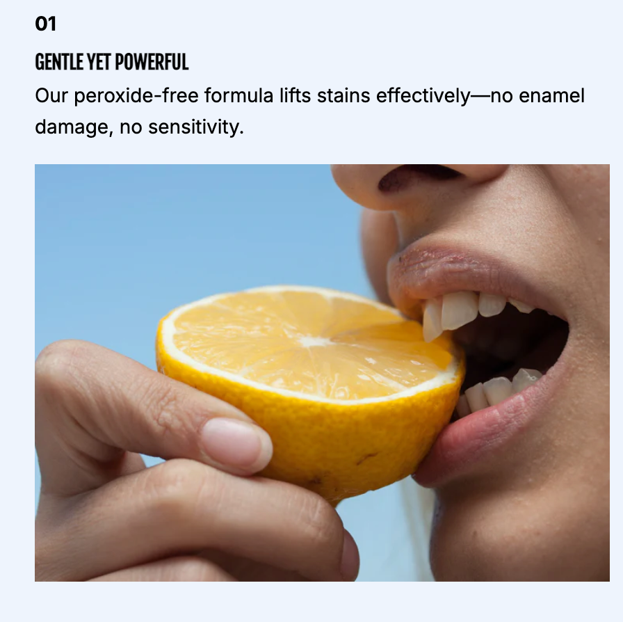 - Gentle, peroxide-free formula protects enamel